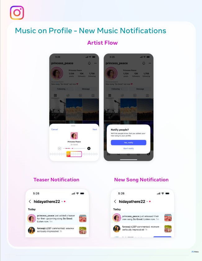 🎸 Music marketers take note: Meta is rolling out an organic-only product called New Music Notifications. These in-platform notifications surface to an artist’s most engaged fans when they add a pre-release teaser or new song to their Instagram profile. This is not currently in the pipeline for paid ads: