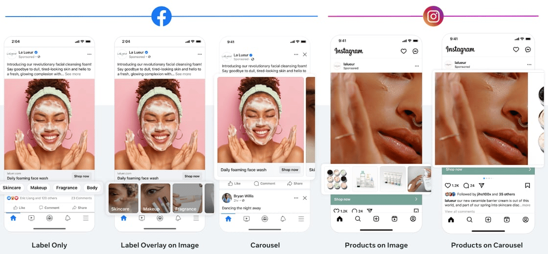 As of this month, all single media and Advantage+ catalog collection ads on Facebook Feed will no longer feature a display URL in the ad footer. Instead, the ad footer will now appear below the media tiles for both “show products” and “show site links.”