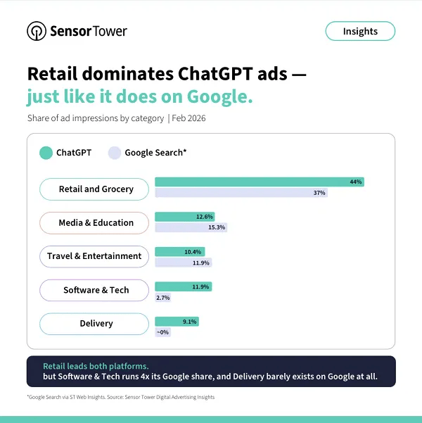 💡 Because ads are only served when relevant to the conversation, this data continues to signal a migration of prospecting audiences toward the chatbot for shopping and research instead of traditional search.